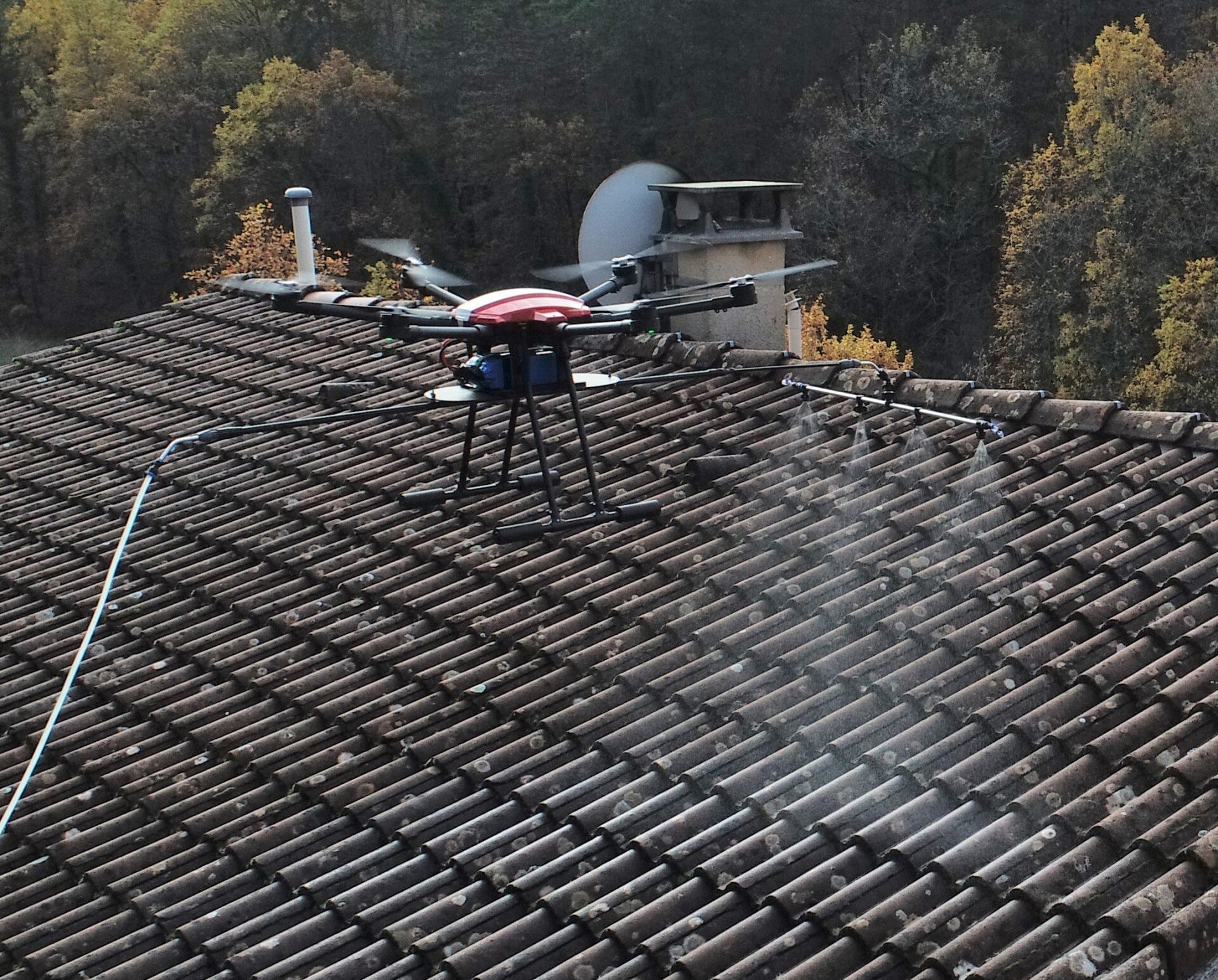 Le nettoyage par drone, c’est rapide, pas besoin de monter des échafaudages, et c’est parfait pour les bâtiments jusqu’à 60 mètres de haut.